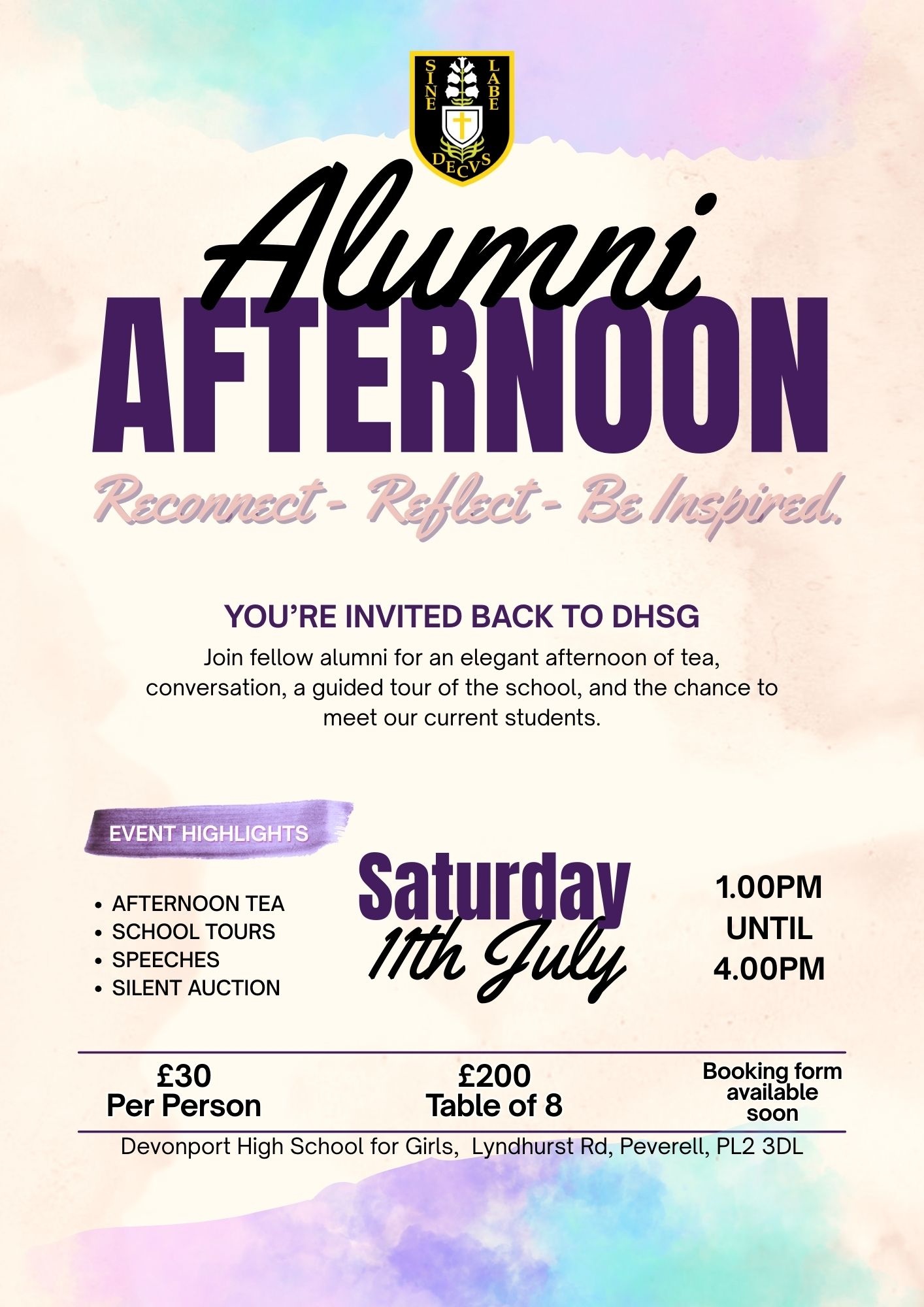 We are delighted to invite you to save the date for a special Summer Alumni Afternoon, taking place on Saturday 11 July, from 1.00pm to 4.00pm, at Devonport High School for Girls.